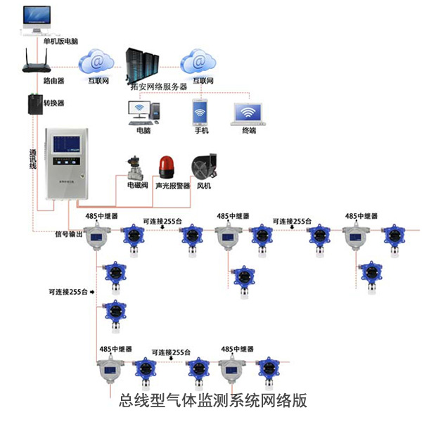 分線一般傳輸?shù)氖悄M信號,我們一般采用二線制4-20mA信號或三線制4-20mA信號;一般4mA對應(yīng)量程的底限,而20mA則對應(yīng)量程的高限。分線主要應(yīng)用在探測器數(shù)量少,分布不集中,離控制室較近且系統(tǒng)安全要求較高的場合。其優(yōu)點是系統(tǒng)安全可靠;行業(yè)內(nèi)控制器互換性高;缺點是探測器和控制器間不可傳輸命令,不夠智能化;布線不方便。