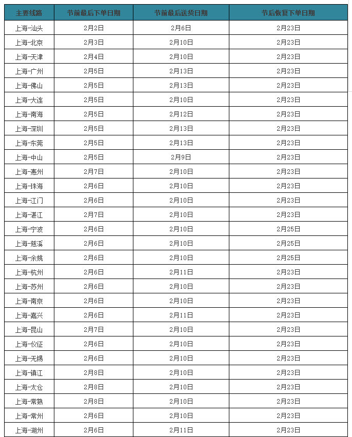 主要線路節(jié)前非常后下單日期節(jié)前非常后送貨日期節(jié)后恢復(fù)下單日期